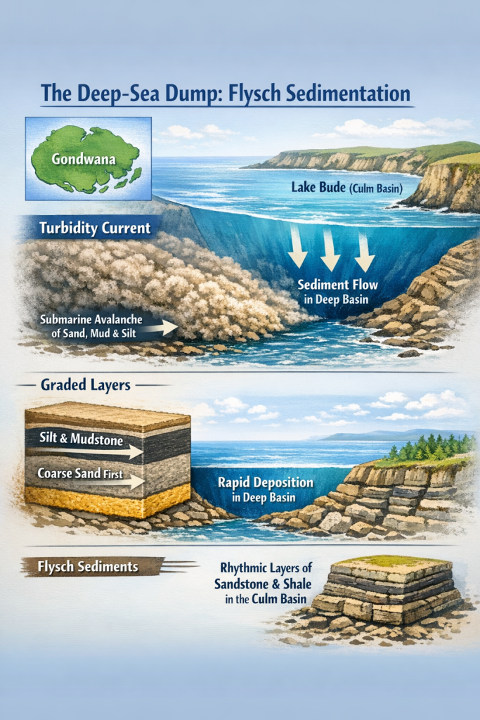• The Result: The result is called flysch sedimentation—a rhythmic, layered stack of rock created by high-energy events followed by long periods of calm. Geologists sometimes refer to this ancient water body as the “Culm Basin.”