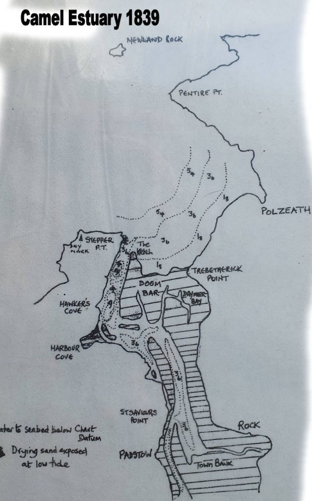 The Doom Bar is a shifting sandbank at the mouth of the Camel Estuary near Padstow, long feared by mariners. Formed where the Atlantic meets the river’s outflow, it partially blocks the harbour approach and has caused hundreds of shipwrecks — with estimates ranging from 400 to over 600 vessels wrecked, stranded, or foundered. Its name, ominously suggesting fate or ruin, reflects its deadly reputation. Historically, the bar lay farther west, but over time has migrated inland and eastward, reshaped by tides, storms, and coastal erosion. Admiralty charts from the 18th century onward reveal how its structure has become more fragmented and unpredictable.