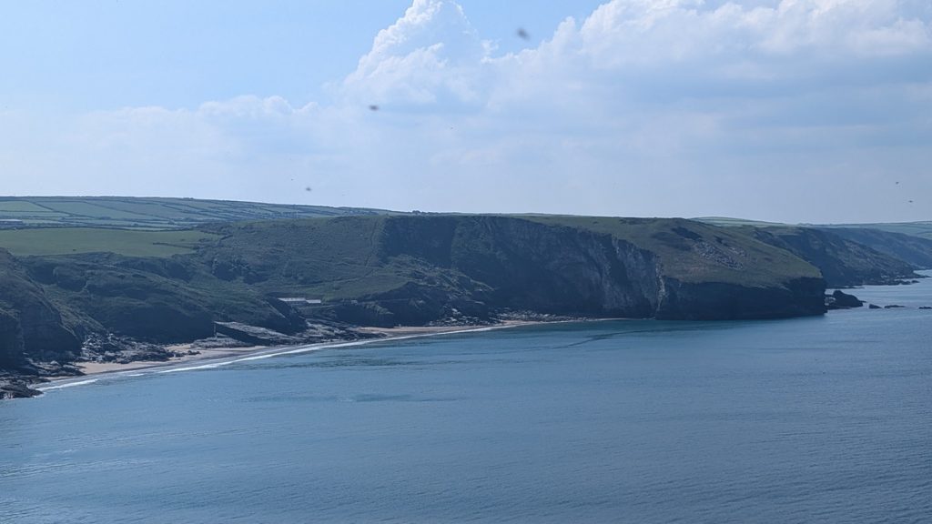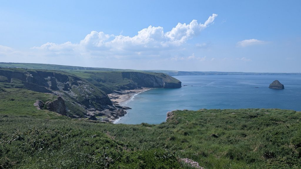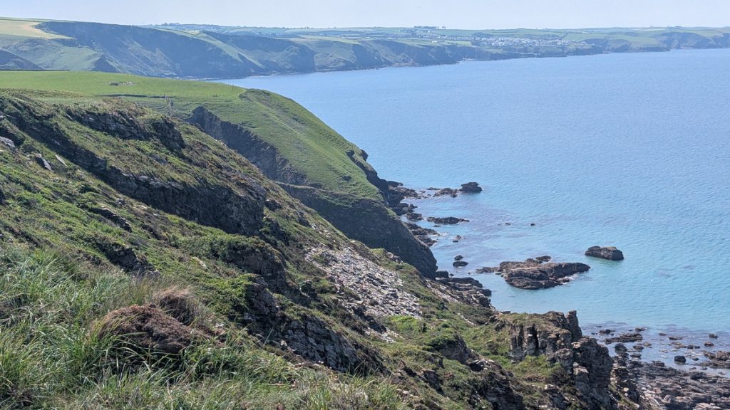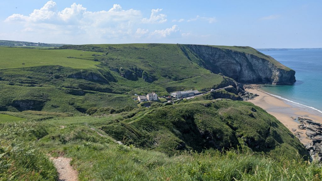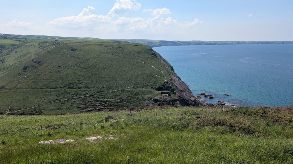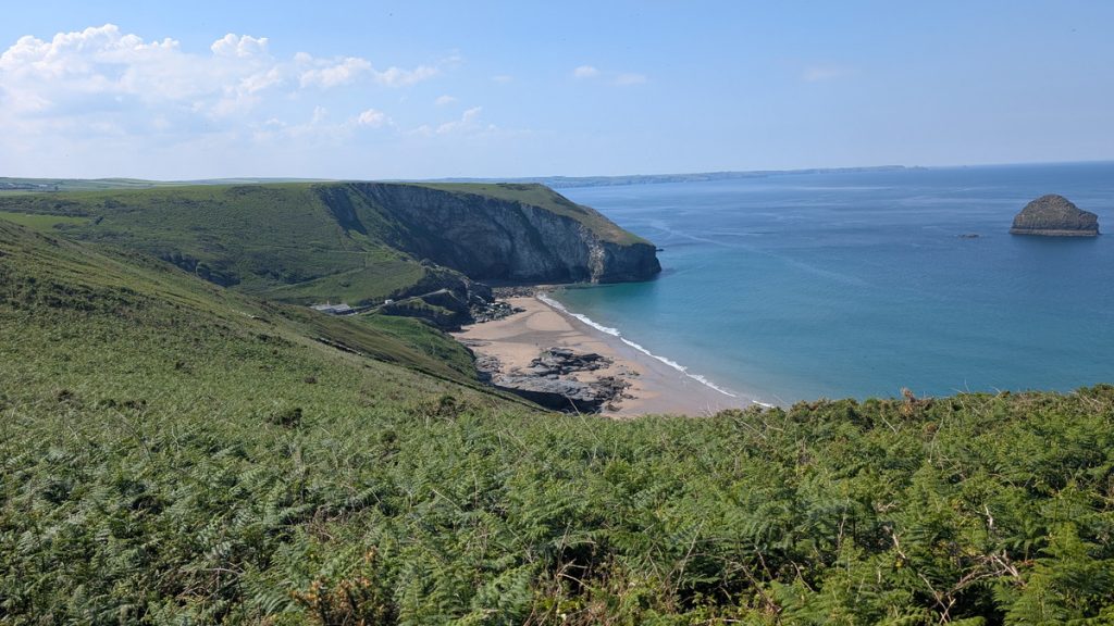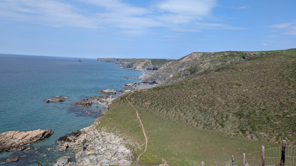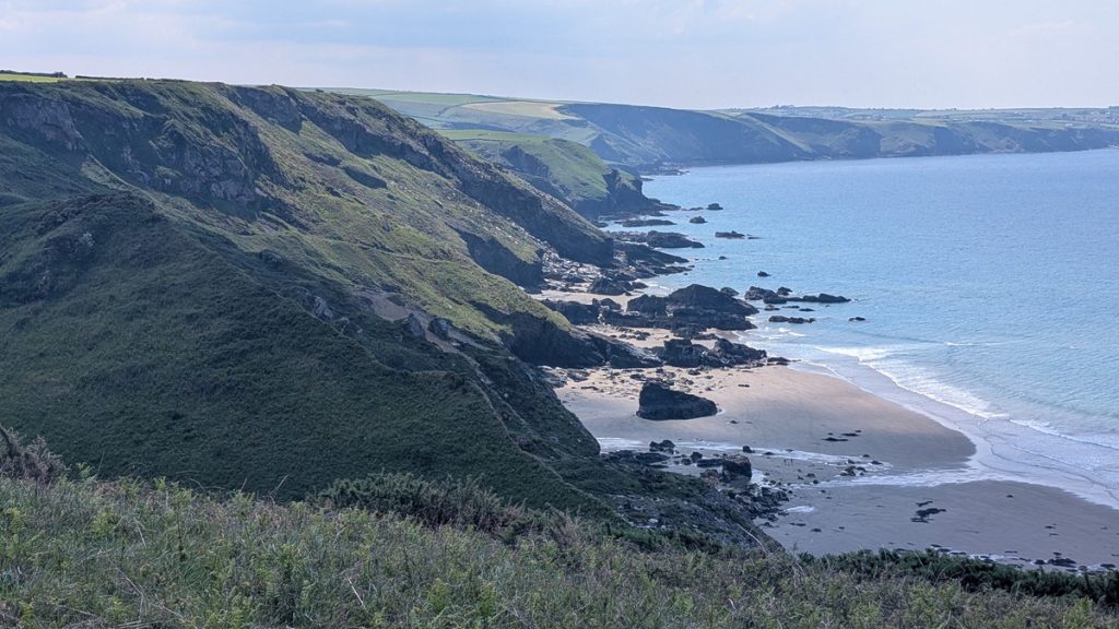A gentler section across open clifftops with wide views, ending in a dip to Tregardock Beach and a sharp ascent behind the ‘Mountain’.