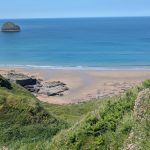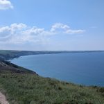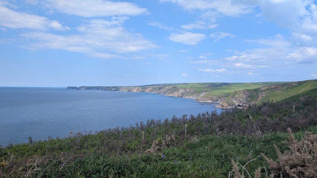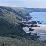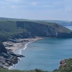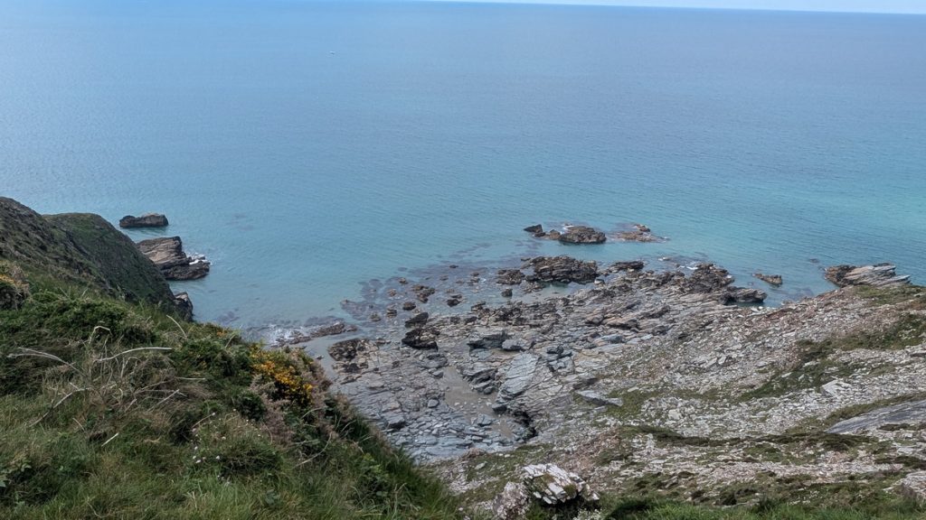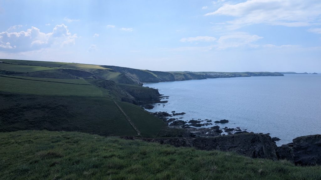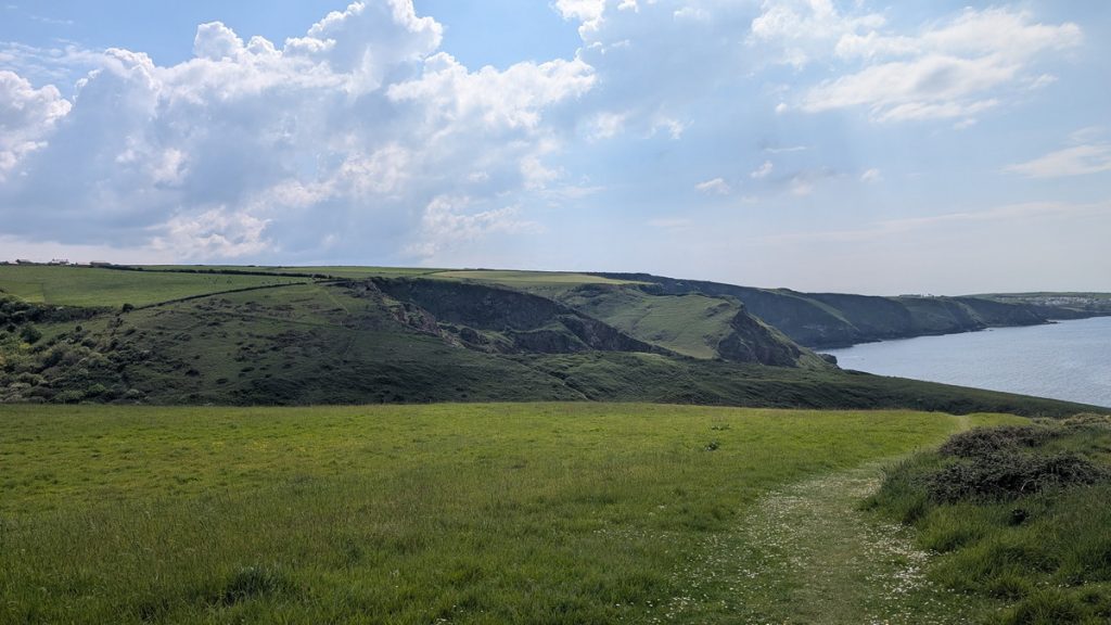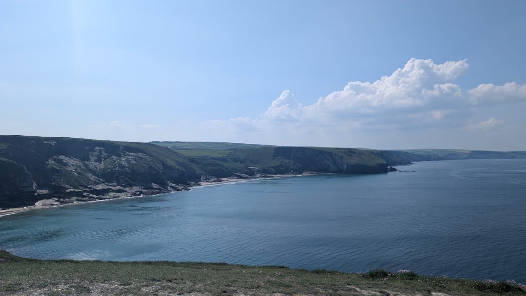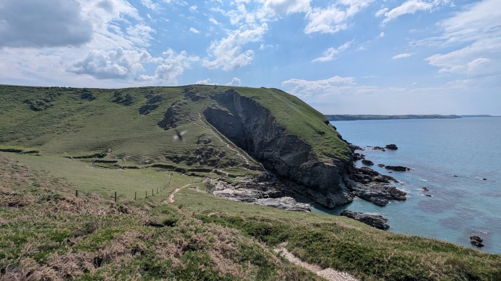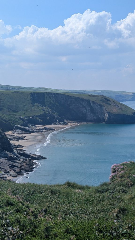 A gentler section across open clifftops with wide views, ending in a dip to Tregardock Beach and a sharp ascent behind the ‘Mountain’.