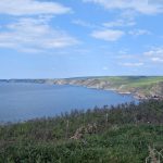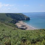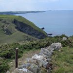 A steep climb leads to narrow cliff paths, followed by a descent into the valley behind Backways Cove and a zigzag climb out.
