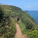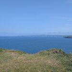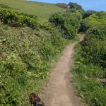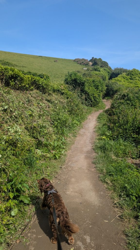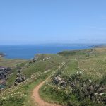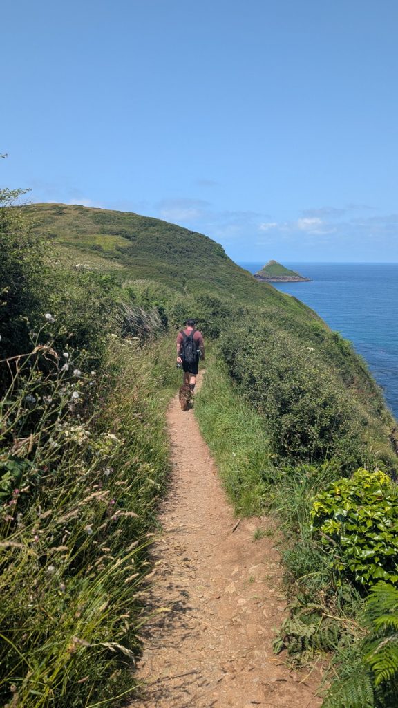 The path levels above the beach named after Lundy Island, with open grassland and wide coastal views.