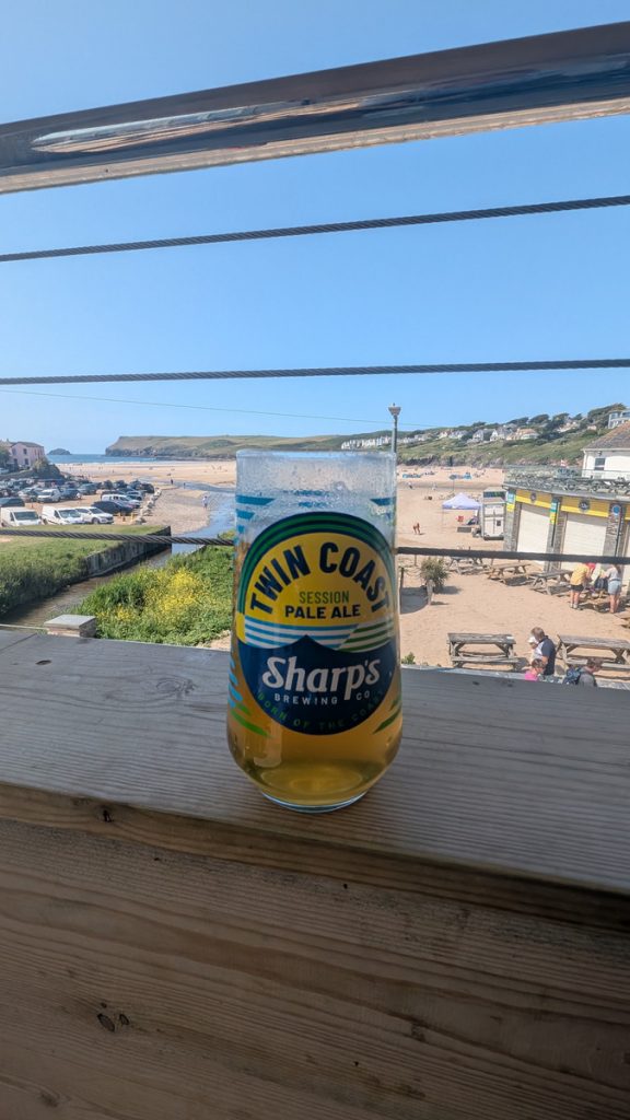 A lively surf beach and seaside village, ideal for a mid-walk drink — but no dogs allowed in summer.