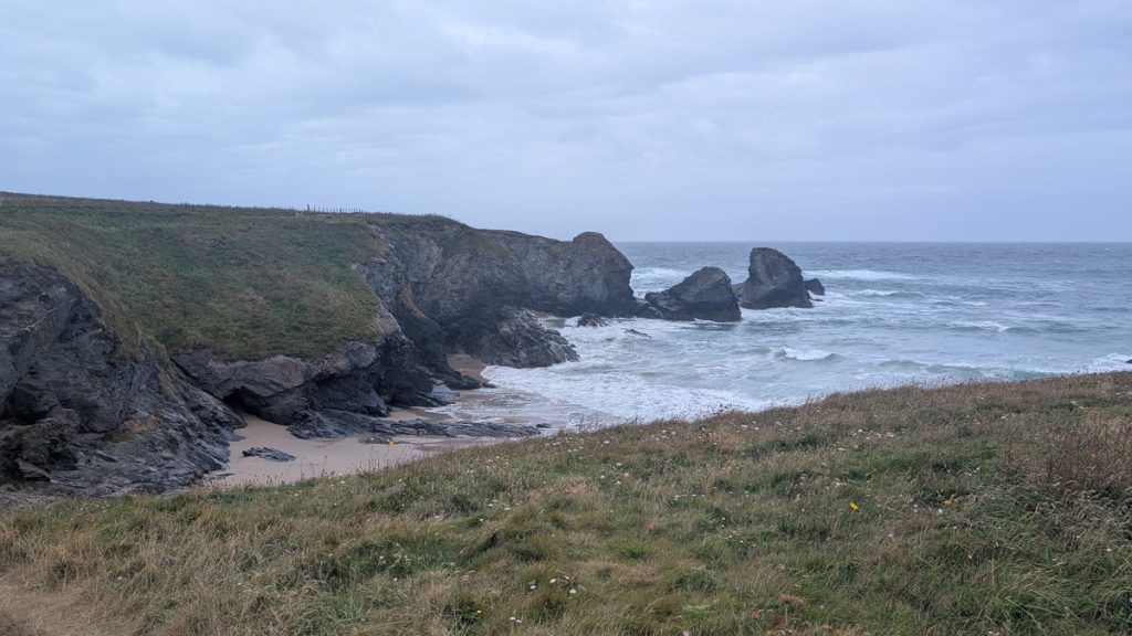 A gradual descent reveals the wide beach of Mawgan Porth. At low tide, it’s walkable; otherwise, cliff paths offer the scenic route.