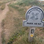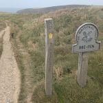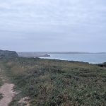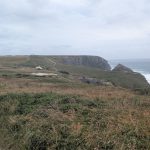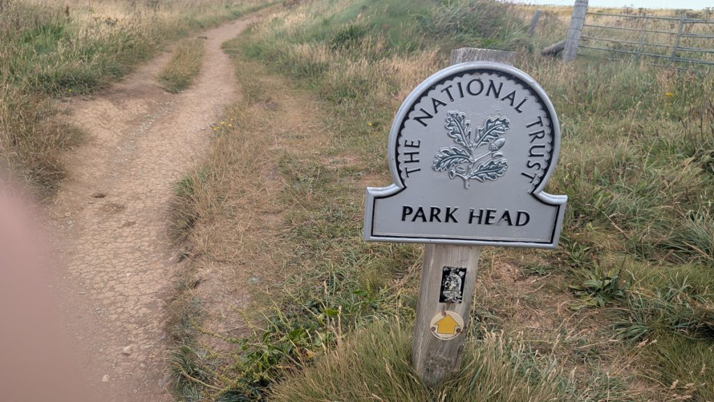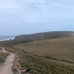 The path detours inland here due to instability, then returns to the headland overlooking Porth Beach and reconnects with the coast.