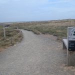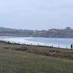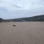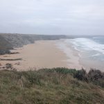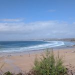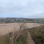 A vast 2-mile sweep of golden sand popular with surfers. The path descends through a holiday complex before climbing again.