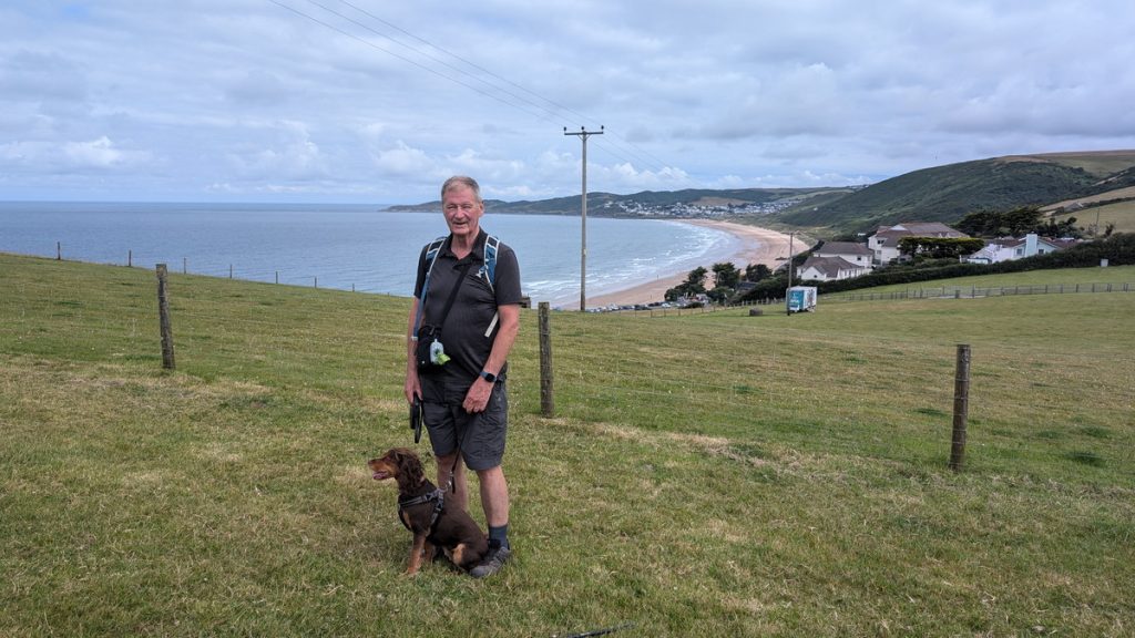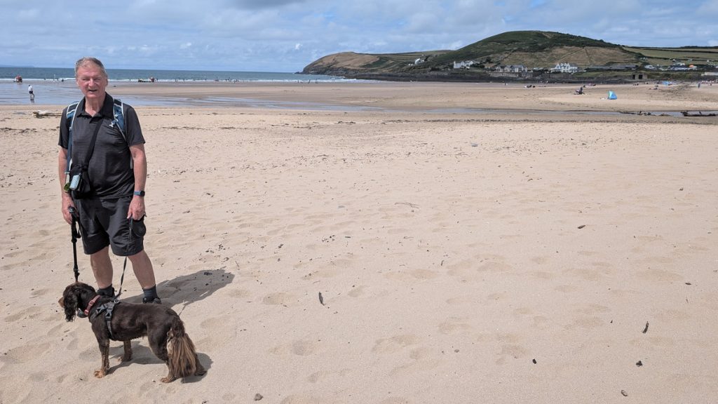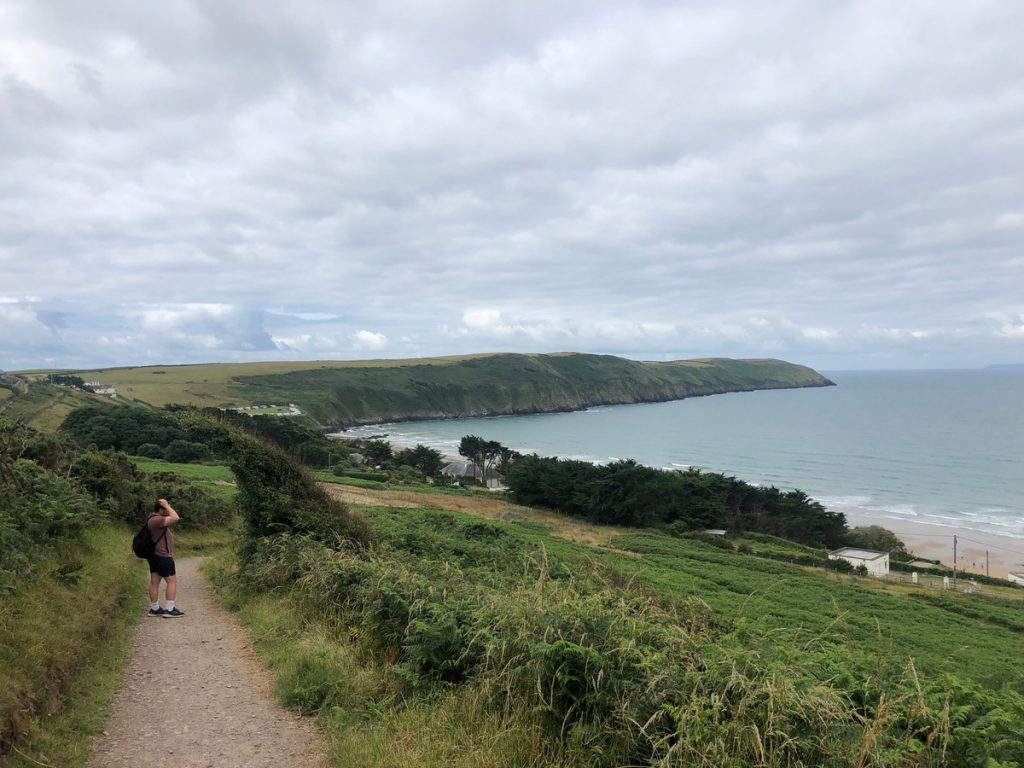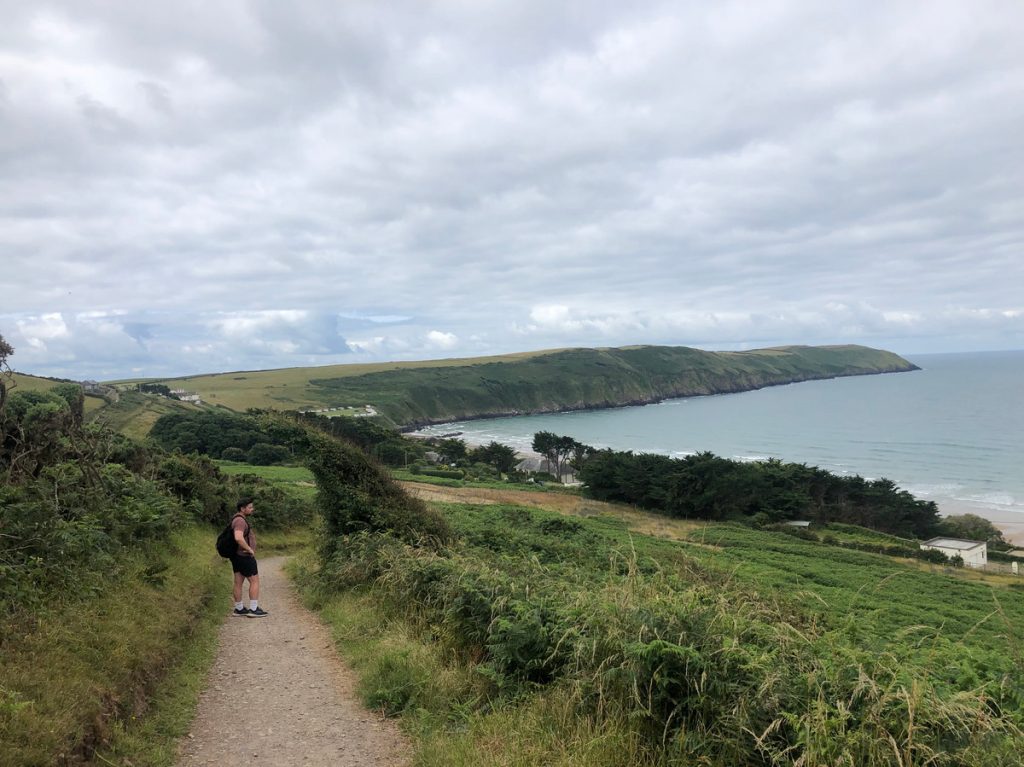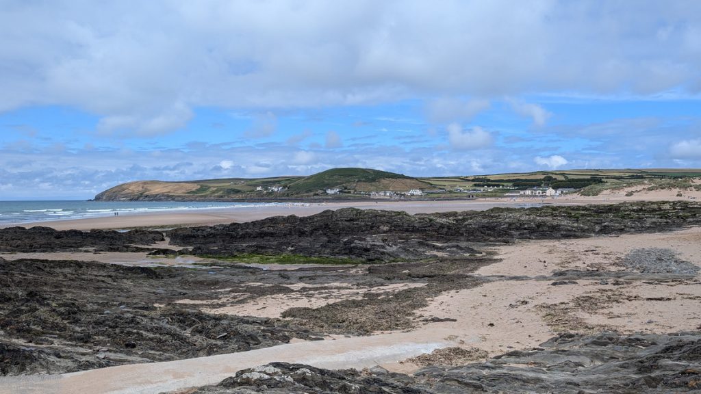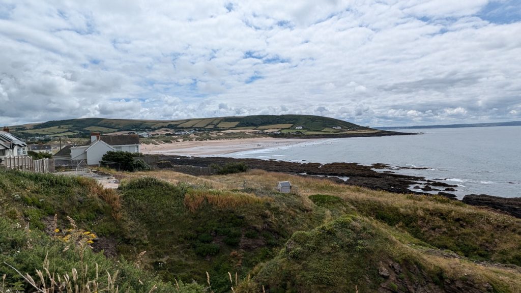 A lively surf village with a sandy beach backed by dunes. The official path skirts the beach before climbing inland past a well-known Grand Designs house.