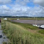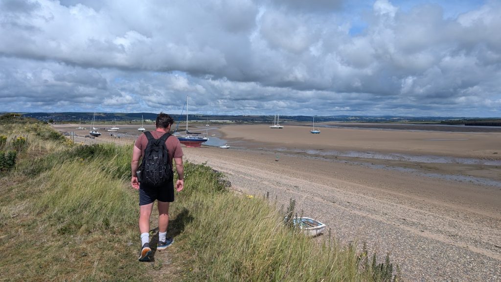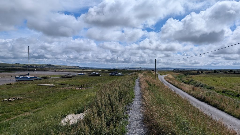 An old quay on the approach to Braunton, where the path follows a raised dyke past salt flats and boats stranded in the mud.