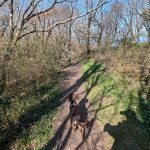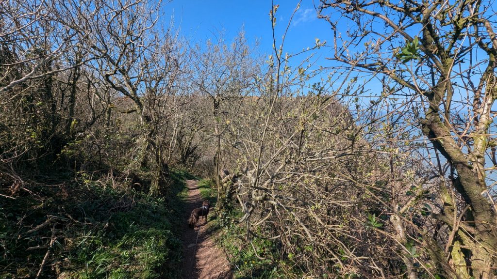 The walk begins at the top of Clovelly, following a wooded track past the 1826 Angel Wings shelter and onto open ground.